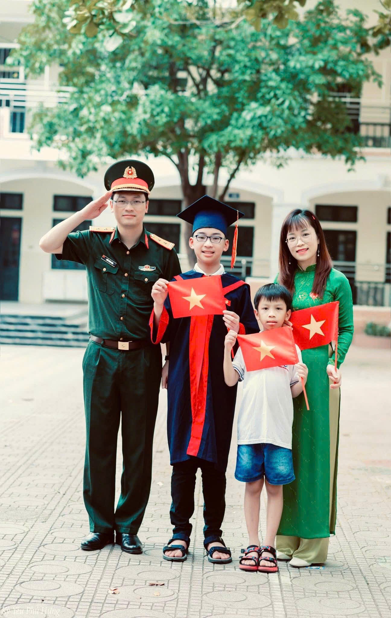 Niềm tự hào lớn nhất của Trung tá Ninh và chị Dung là cậu con trai Trần Minh Khang, học sinh lớp 5A2, Trường Tiểu học Nguyễn Du, quận Hà Đông, Hà Nội. Dù mới 11 tuổi, Minh Khang đã đạt những thành tích vượt trội, trở thành tấm gương sáng cho thế hệ trẻ. Trong kỳ thi tuyển sinh lớp 6 năm học 2025-2026, Minh Khang xuất sắc đỗ cả bốn trường THCS chất lượng cao tại Hà Nội, bao gồm: Đồng thủ khoa Trường THCS Cầu Giấy với 28,75/30 điểm; vượt điểm chuẩn Trường THCS Ngoại ngữ (102/99); đạt 26,75/24 điểm tại Trường THCS&THPT Nguyễn Tất Thành và 62,55/57 điểm tại Trường THCS Thanh Xuân. Những kết quả này không chỉ thể hiện năng lực học tập mà còn cho thấy sự nỗ lực và tư duy vượt trội của cậu bé.