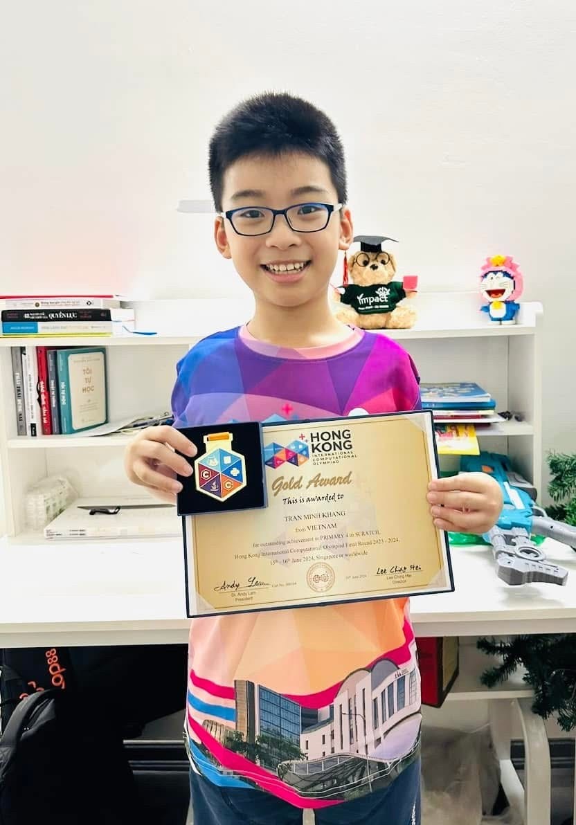 Minh Khang còn ghi dấu ấn trong nhiều lĩnh vực khác. Em đạt điểm tuyệt đối 230/230 trong cuộc thi tiếng Anh TOEFL Primary Challenge 2024-2025, giành giải Nhì Olympic tiếng Anh cấp tiểu học quận Hà Đông, giải cá nhân xuất sắc Olympic tiếng Anh cấp thành phố Hà Nội, và lọt Top 10 thí sinh xuất sắc nhất vòng loại cuộc thi Tài năng Tin học trẻ Quốc tế tại Hà Nội. Đặc biệt, trong năm học 2023-2024, khi mới học lớp 4, Minh Khang đã giành hai Huy chương Vàng tại cuộc thi Olympic Tin học Quốc tế HKICO ở cả vòng Quốc gia và Quốc tế – một thành tích hiếm có ở độ tuổi này.