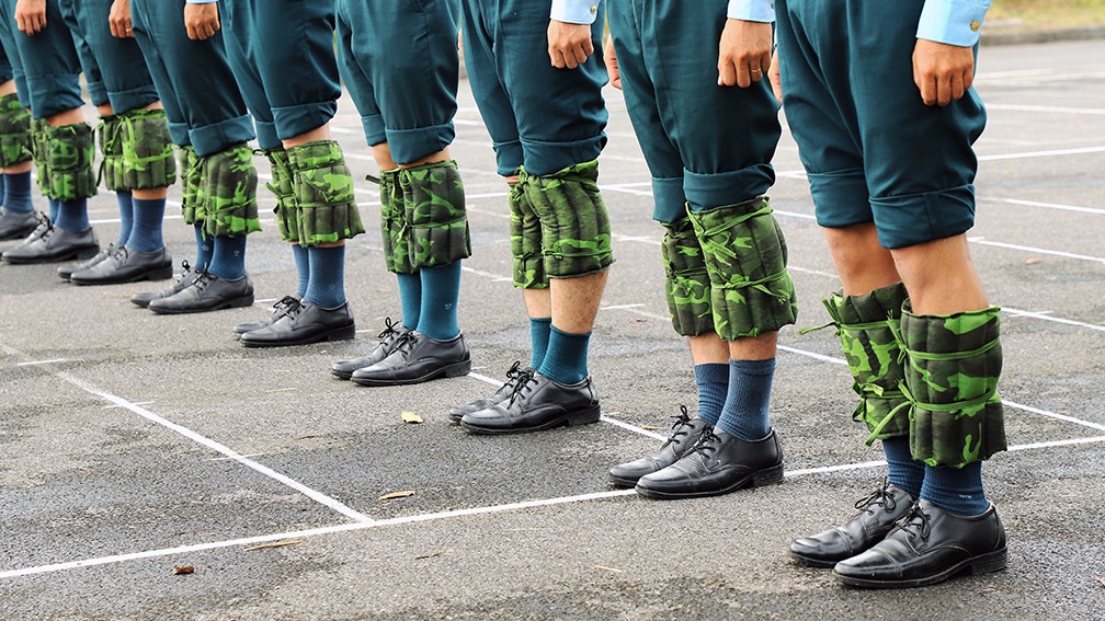 Khi mặt trời còn e ấp sau rặng núi, những bước chân đều tăm tắp đã vang lên, xuyên qua sương sớm. Trong suốt bảy giờ huấn luyện mỗi ngày, không chỉ là rèn động tác mà là rèn bản lĩnh, tư thế, tinh thần. Hai khối, khối đứng và khối đi hiện thân cho hai sức mạnh: vững chãi như tượng đài và cuồn cuộn như dòng thác.