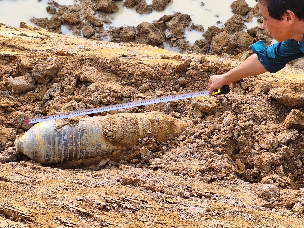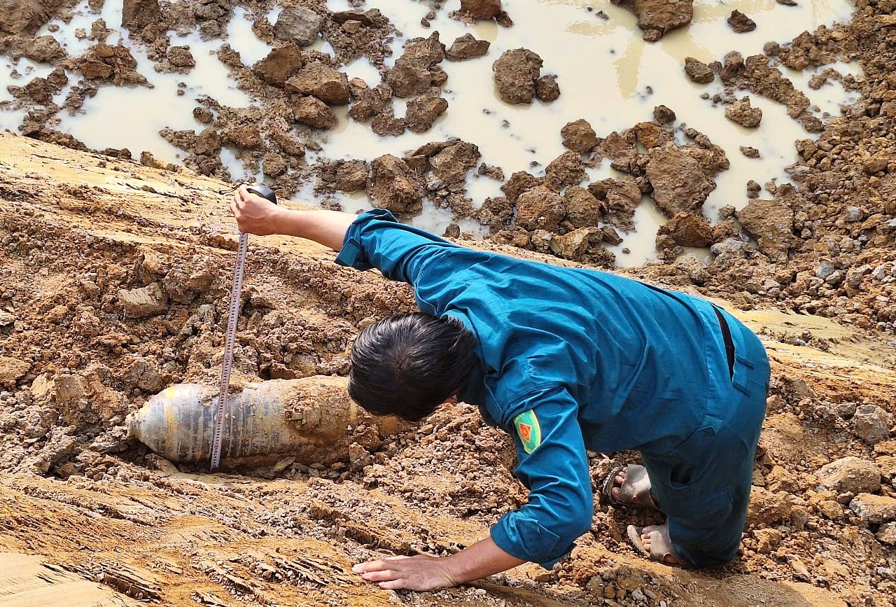 Theo mô tả vật thể nghi là quả bom lớn không nhìn rõ ký hiệu, phía trên thân vật thể được sơn màu nâu và các vòng tròn màu vàng, có chiều dài gần 1 mét, đường kính 30 cm, thời điểm phát hiện quả bom nằm lộ thiên trên mặt đất.