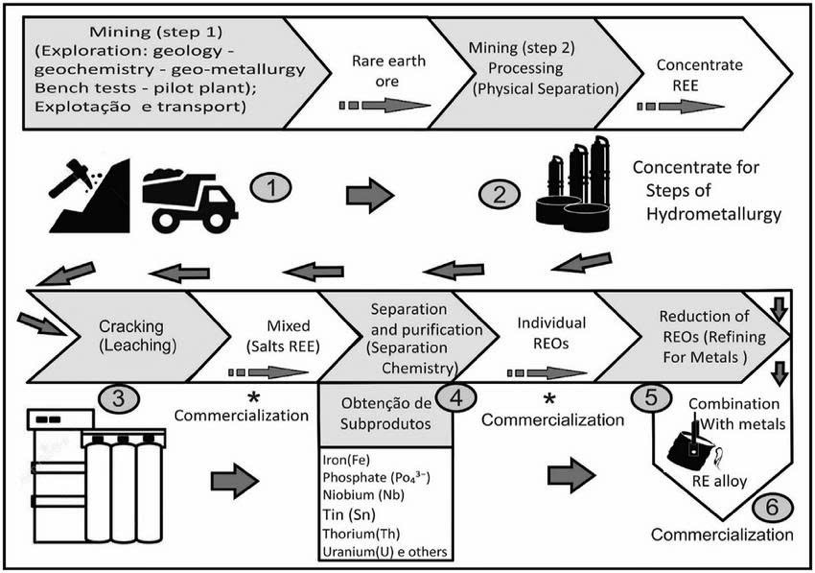 Đất hiếm (REE - Rare Earth Elements) không tồn tại ở dạng nguyên chất trong tự nhiên mà phân tán trong các khoáng vật khác nhau, đi kèm với nhiều tạp chất. Quy trình xử lý đất hiếm từ khai thác đến tạo hợp kim trải qua chuỗi công đoạn phức tạp, bao gồm ba giai đoạn chính: (1) khai thác – tuyển khoáng, (2) thủy luyện – tinh chế, và (3) chế tạo hợp kim – xử lý sản phẩm phụ.