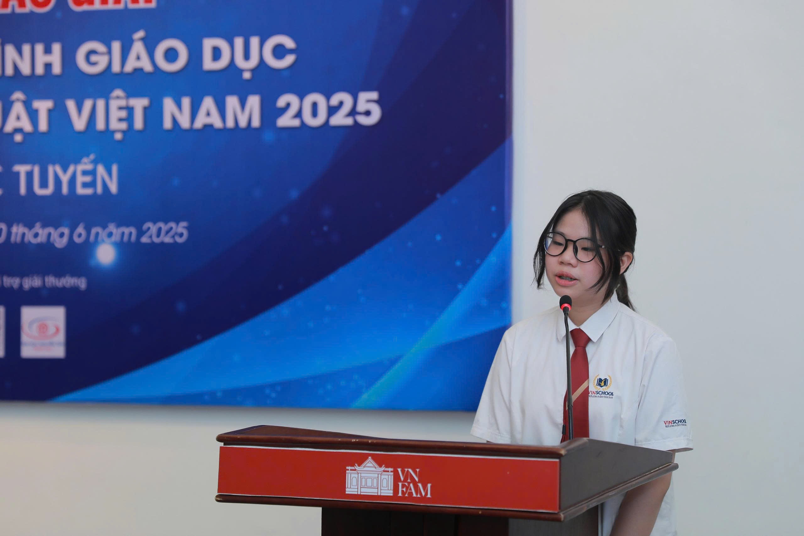 Tại lễ trao giải, em Lê Gia Hân - học sinh đạt giải cá nhân, xúc động chia sẻ: "Em rất vui và vinh dự khi có mặt tại Lễ trao giải cuộc thi tìm hiểu Mỹ thuật Việt Nam năm 2025. Thông qua chương trình, em và các bạn đã có thêm rất nhiều kiến thức về mỹ thuật cũng như văn hóa Việt Nam, em đã dự thi nhiều lần và chắt lọc các kiến thức để hoàn thiện các bài dự thi sau. Em cảm thấy chương trình vô cùng bổ ích. Qua đây, em xin gửi lời cảm ơn chân thành tới Bảo tàng Mỹ thuật Việt Nam, thày cô giáo bộ môn Mỹ thuật của trường, và em mong những năm sau, em và các bạn sẽ tiếp tục tham gia và hy vọng sẽ nhận giải thưởng của chương trình”.