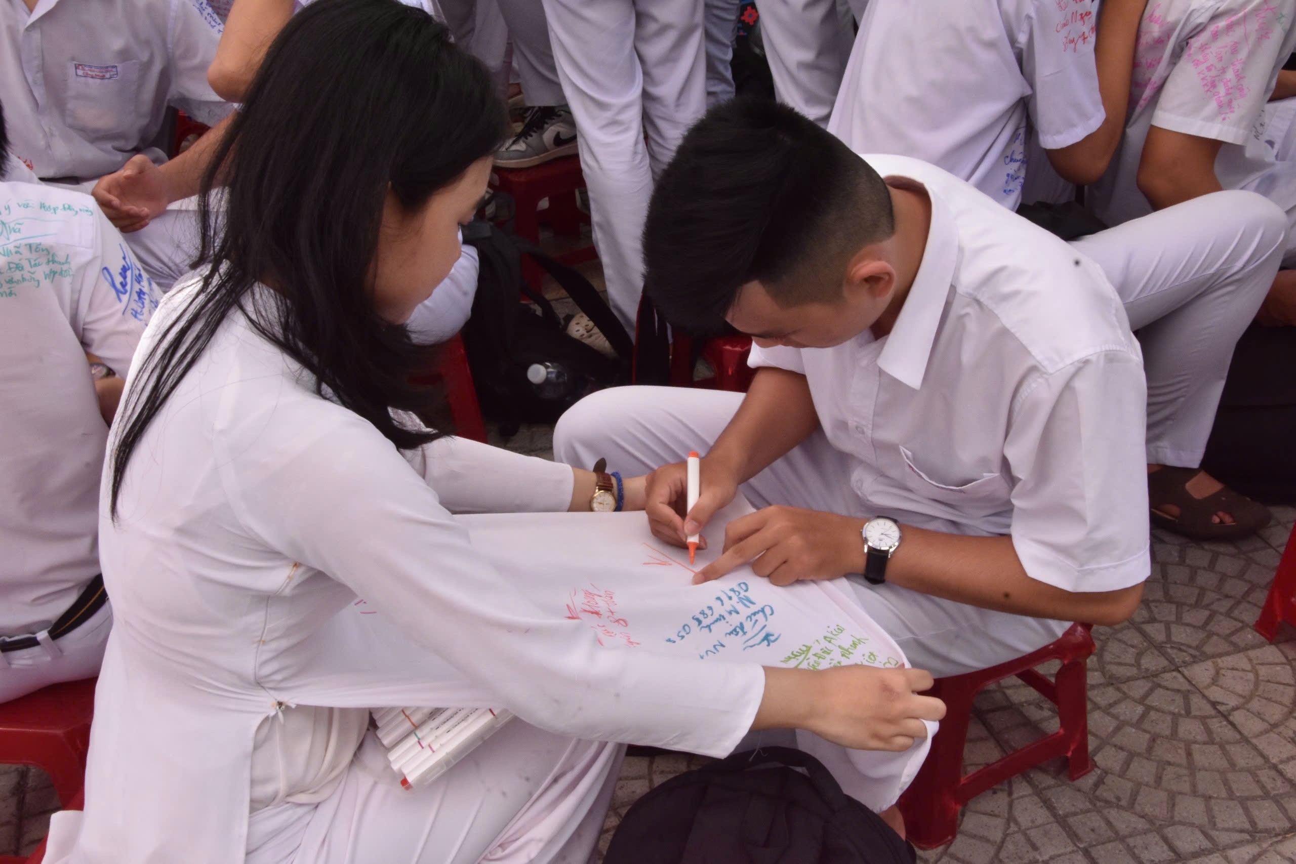 Kết thúc phần lễ, sân trường trở nên rộn ràng với những khoảnh khắc chia tay đầy cảm xúc. Học sinh lớp 12 tranh thủ lưu lại kỷ niệm cùng thầy cô, ký tên lên áo đồng phục, trao nhau lời chúc trước khi bước vào kỳ thi tốt nghiệp. Những hình ảnh ấy đầy lưu luyến đó đã khép lại một năm học trọn vẹn và mở ra hành trình mới cho thế hệ học sinh niên khóa 2022–2025.